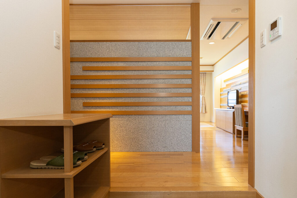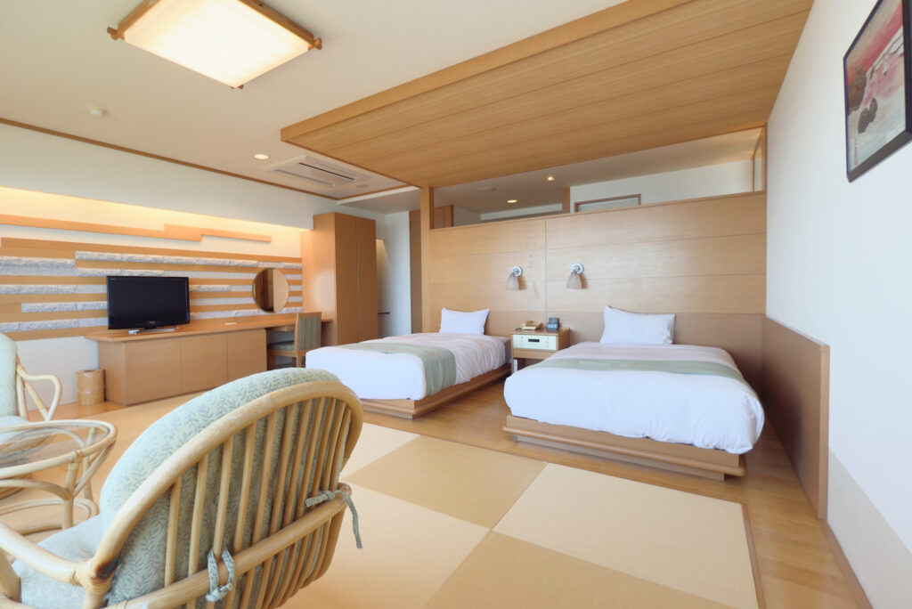 This twin room has a stylish Japanese-style modern interior decorated with alternate stone and wood.