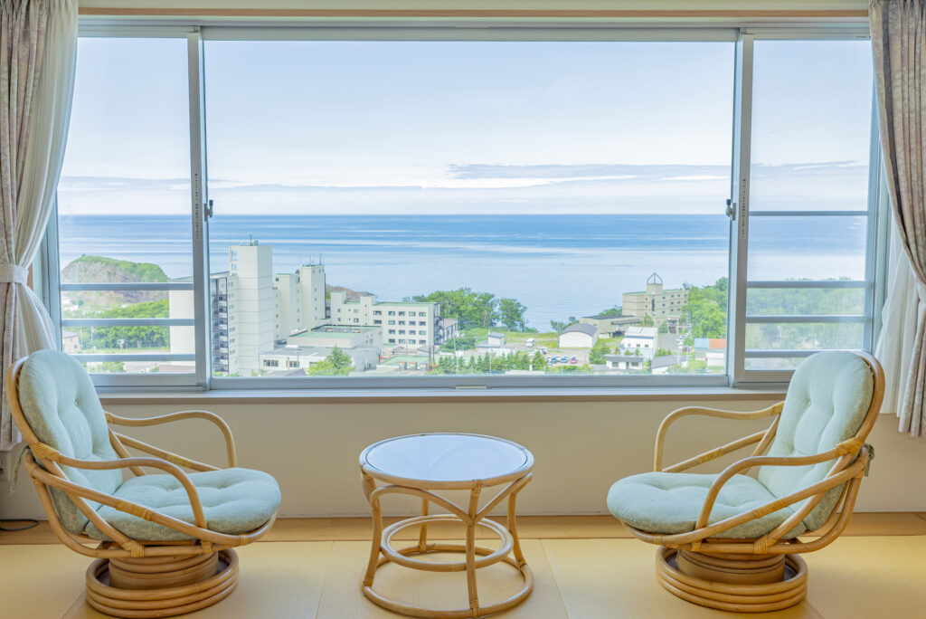 The indirect lighting is pleasant, and you can enjoy a panoramic view of Okhotsk's ocean while relaxing with your shoes.