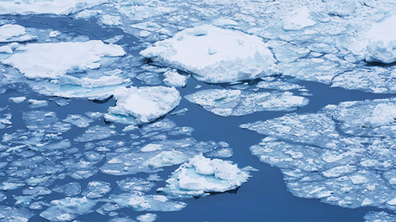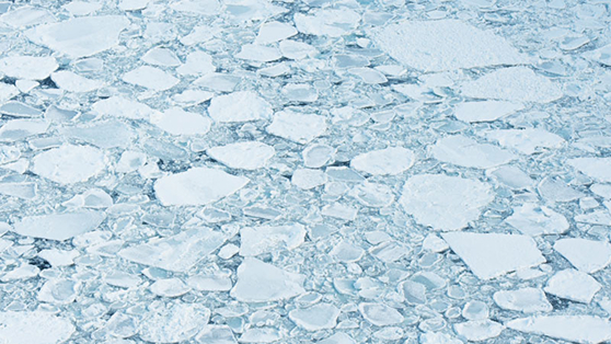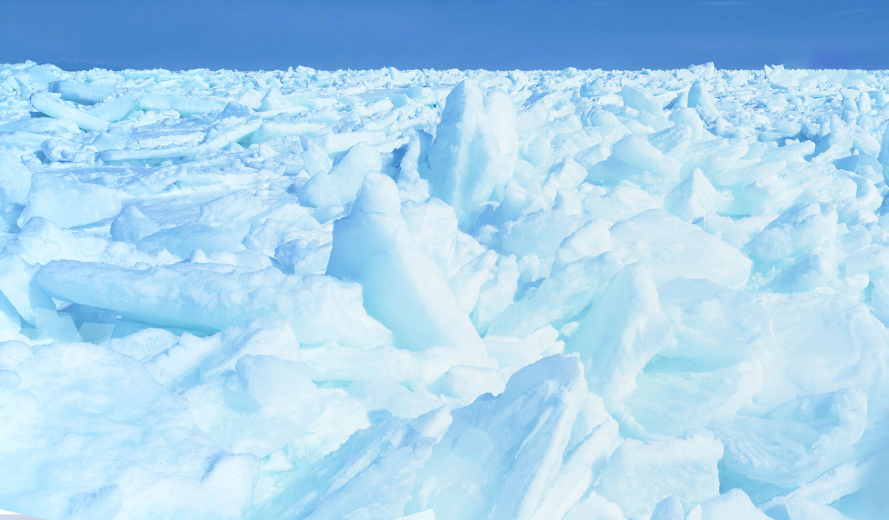 Unimaginable from the summer sea, the blue and wide sea is filled with white ice, creating a mysterious sight.